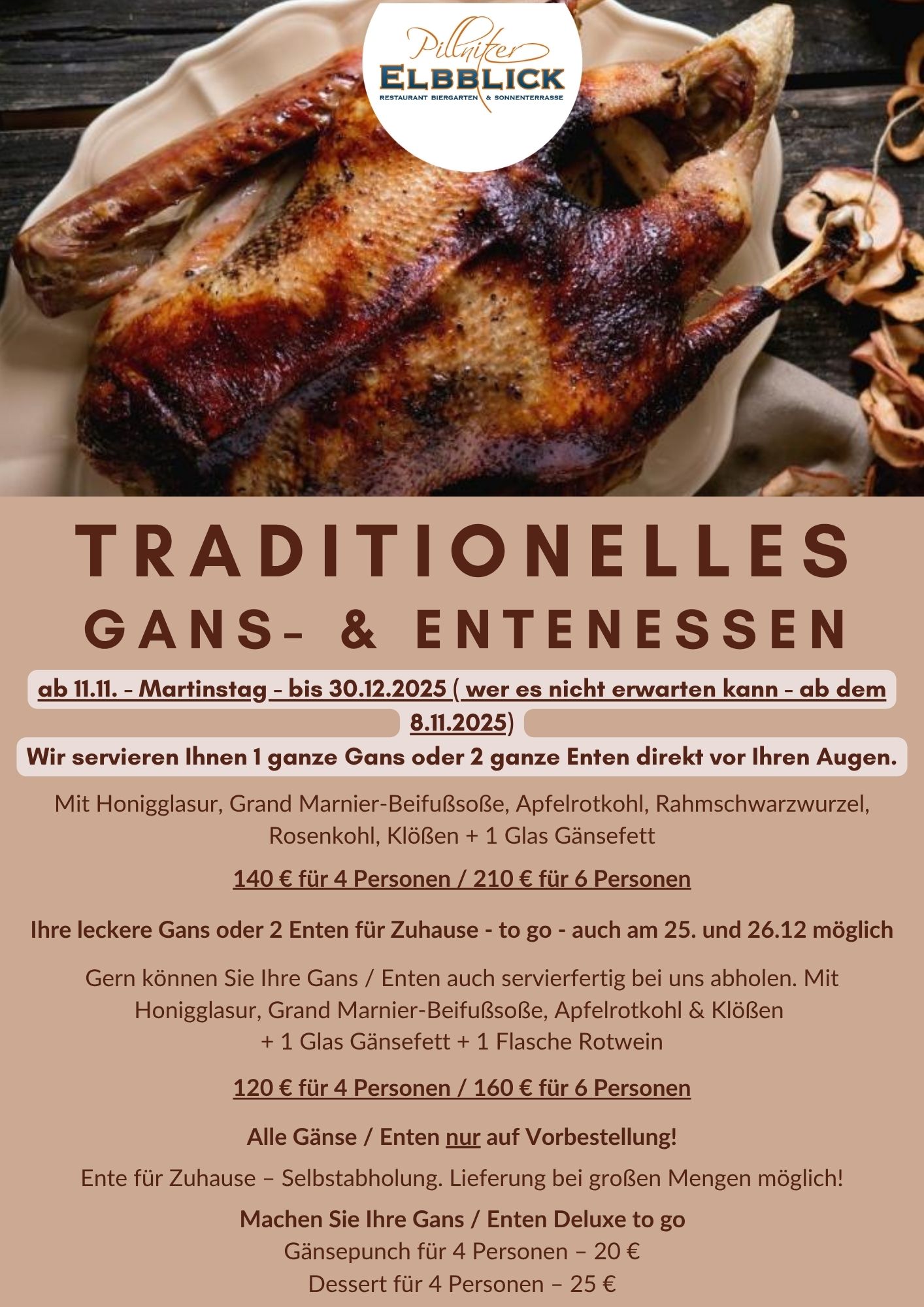 Unsere berühmte Martinsgänse bekommen Sie bei uns im Restaurant oder auch to-go! (mit Vorbestellung)
